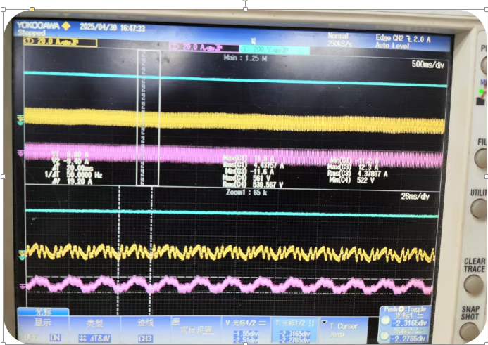 Red Trace: U-phase output current waveform of the 55 kW main frequency inverter (used to check for vibration).